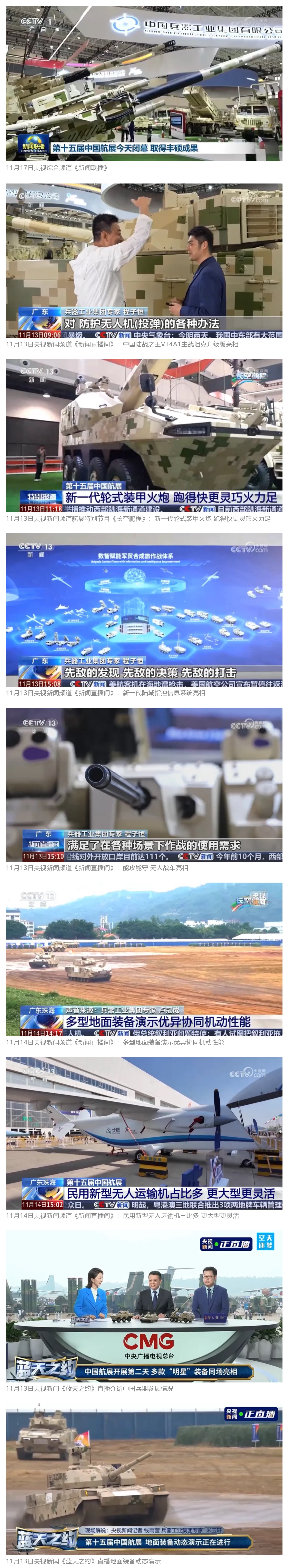 11月13日央視新聞《藍(lán)天之約》直播地面裝備動(dòng)態(tài)演示此次航展,央視綜合頻道《新聞聯(lián)播》《晚間新聞》、新聞?lì)l道《新聞直播間》《新聞30分》《朝聞天下》《共同關(guān)注》《東方時(shí)空》《午夜新聞》、財(cái)經(jīng)頻道《天下財(cái)經(jīng)》《經(jīng)濟(jì)信息聯(lián)播》《正點(diǎn)財(cái)經(jīng)》《第一時(shí)間》、中文國(guó)際頻道《今日環(huán)球》《中國(guó)新聞》、國(guó)防軍事頻道《軍事報(bào)道》《正午國(guó)防軍事》《國(guó)防軍事早報(bào)》《軍迷行天下》等欄目共播出兵器工業(yè)集團(tuán)參展相關(guān)新聞報(bào)道40余條。11月10日央視新聞?lì)l道《新聞30分》11月10日央視中文國(guó)際頻道《中國(guó)新聞》11月10日央視國(guó)防軍事頻道《軍事報(bào)道》11月11日央視國(guó)防軍事頻道《正午國(guó)防軍事》